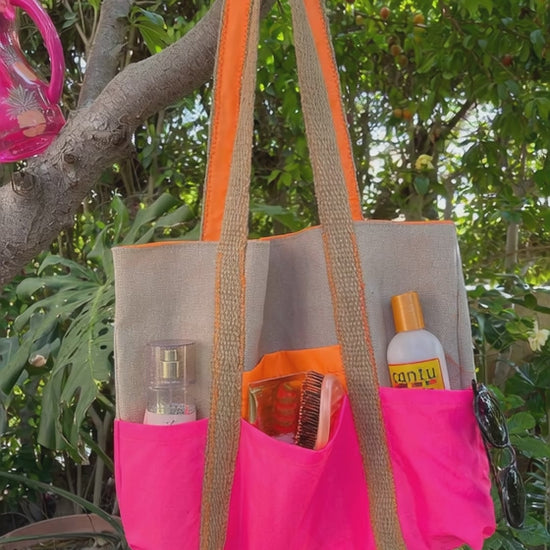 Neon Utility is where function meets flair. Made from sturdy canvas with bold hot pink and orange exterior pockets, this tote is perfect for carrying all your sunny-day essentials — from sunscreen to snacks to sunnies. Features extra-deep pockets, jute-style handles, and an easy-access design.
