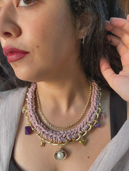 Shell Dreams is where soft textures meet golden shine. This handwoven necklace features a lilac-toned crochet chain paired with golden beads, star charms, and a stunning shell pendant holding a faux pearl. Lightweight yet full of personality, it’s made to stand out whether you're dressing up or keeping it beachy-casual.